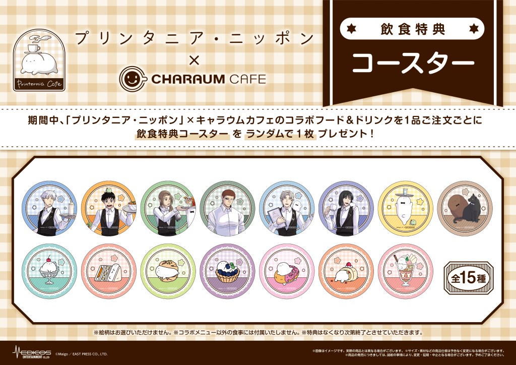 期間中、「プリンタニア・ニッポン」コラボメニューを1品ご注文ごとに特典コースター(全15種)をランダムで1枚プレゼント!