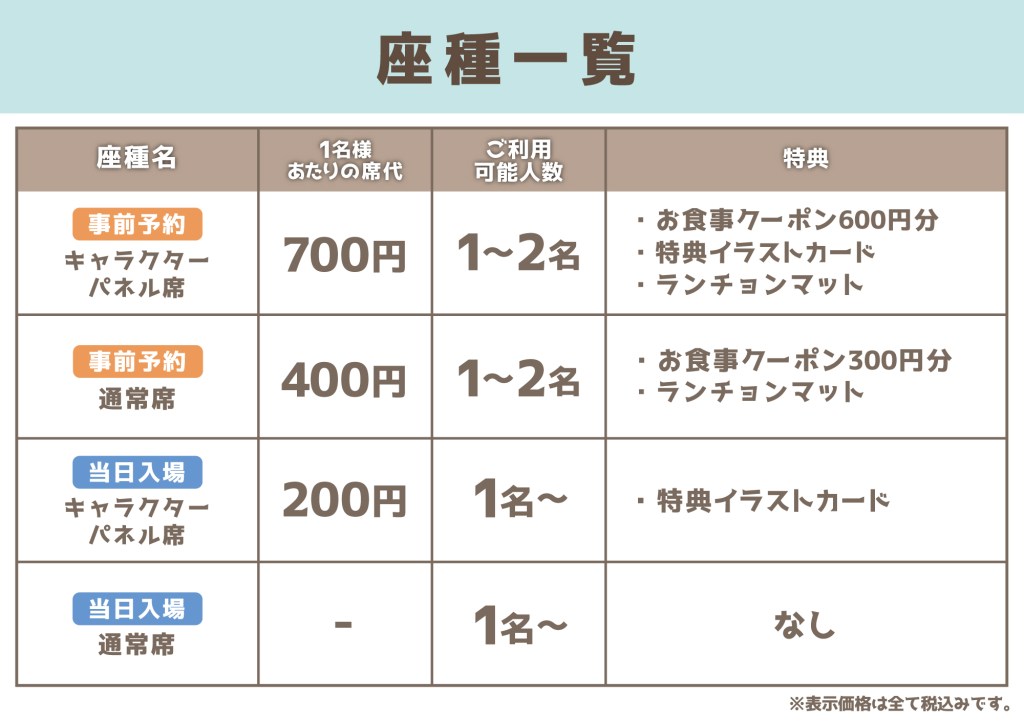 ・当日入場にてキャラクターパネル席をご利用の場合には、キャラクターパネル席代としてご利用1名様につき税込200円を頂戴いたします(通常席をご利用の場合には席代は発生いたしません)。