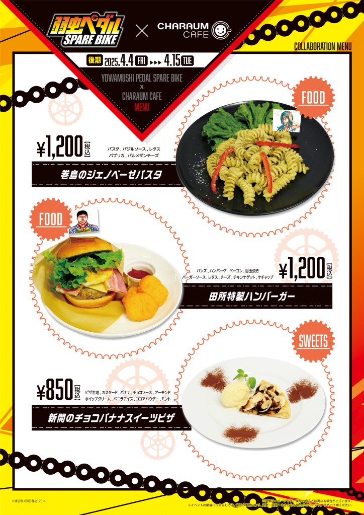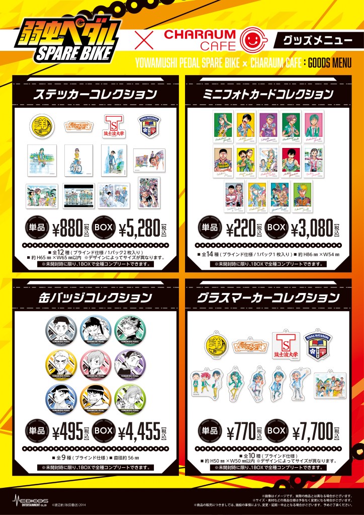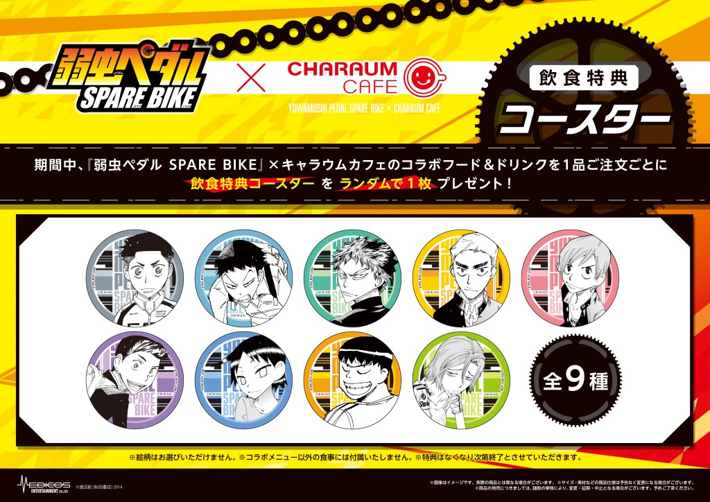 期間中、『弱虫ペダル SPARE BIKE』コラボメニューを1品ご注文ごとに特典コースター(全9種)をランダムで1枚プレゼント!