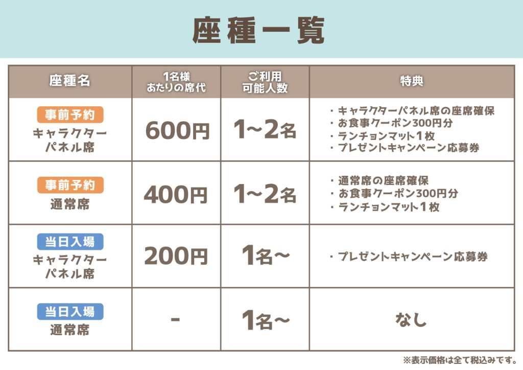 ・当日入場にてキャラクターパネル席をご利用の場合には、キャラクターパネル席代としてご利用1名様につき税込200円を頂戴いたします(通常席をご利用の場合には席代は発生いたしません)。