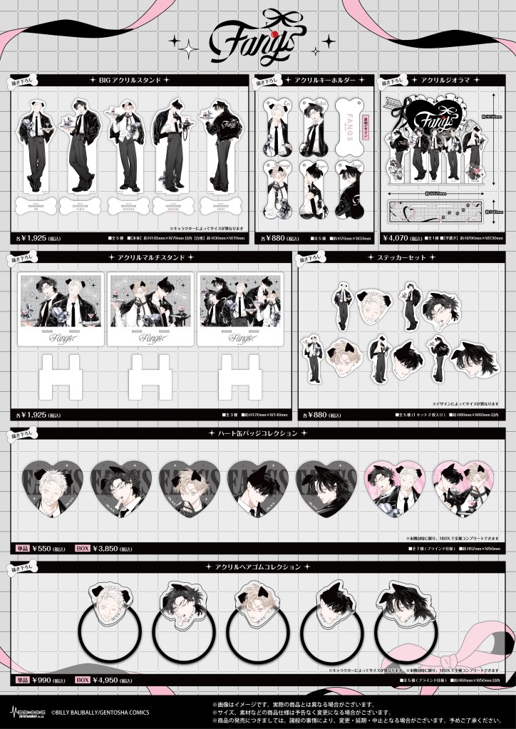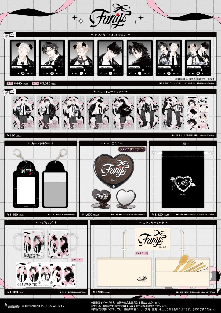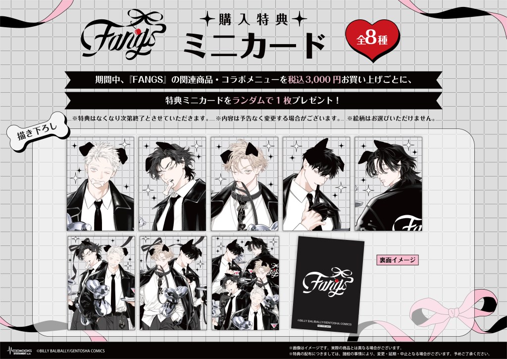 期間中、『FANGS』関連商品(コラボメニューを含む)を税込3,000円お買い上げごとに特典ミニカード(全8種)をランダムで1枚プレゼント!