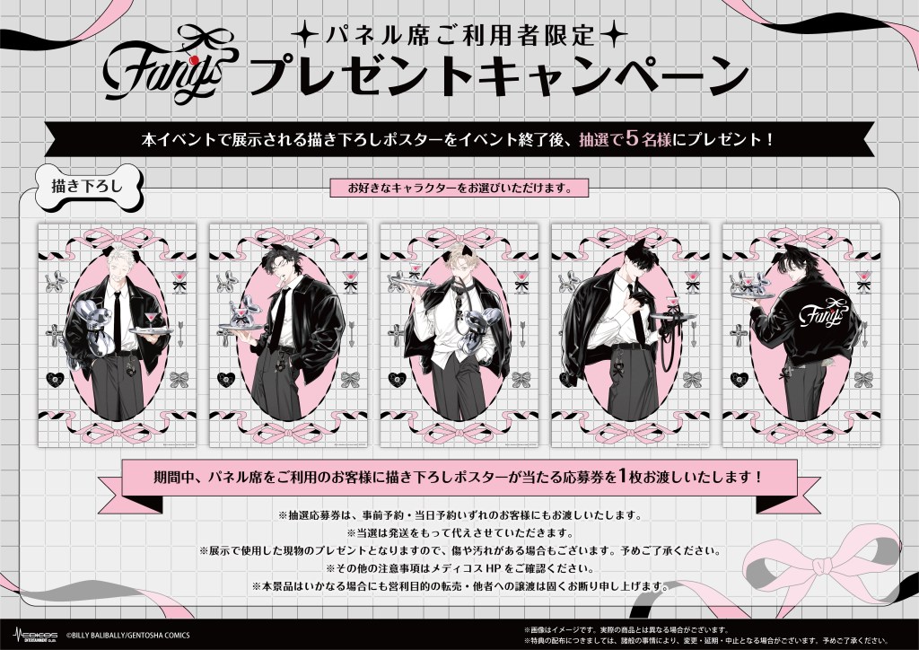 期間中『FANGS』コラボカフェにてキャラクターパネル席をご利用のお客様に、お一人様1回のご利用につき応募券を1枚お渡しいたします。