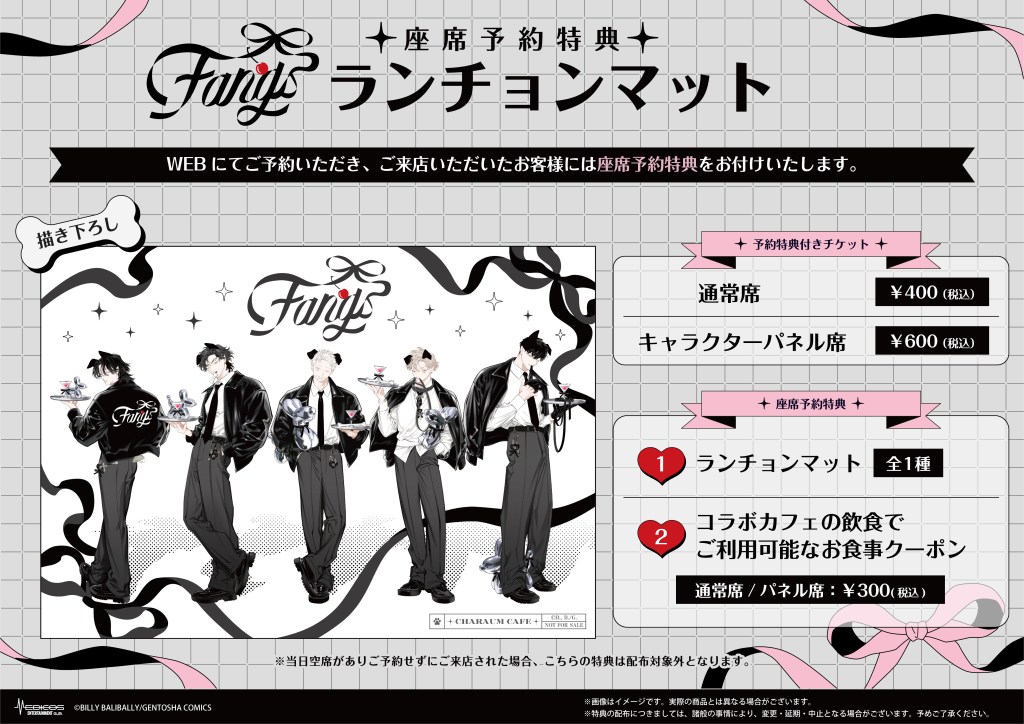 『FANGS』コラボカフェの事前予約チケットをご購入いただき、ご利用いただいたお客様に特典ランチョンマット(全1種)をお一人様につき1枚プレゼント!