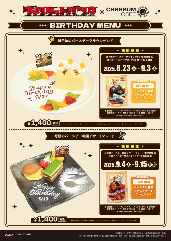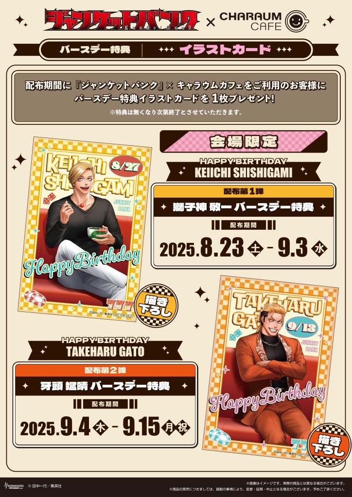 期間中、『ジャンケットバンク』×キャラウムカフェをご利用のお客様に、獅子神 敬一・牙頭 猛晴のお誕生日を記念してバースデーイラストカードを1枚配布いたします!