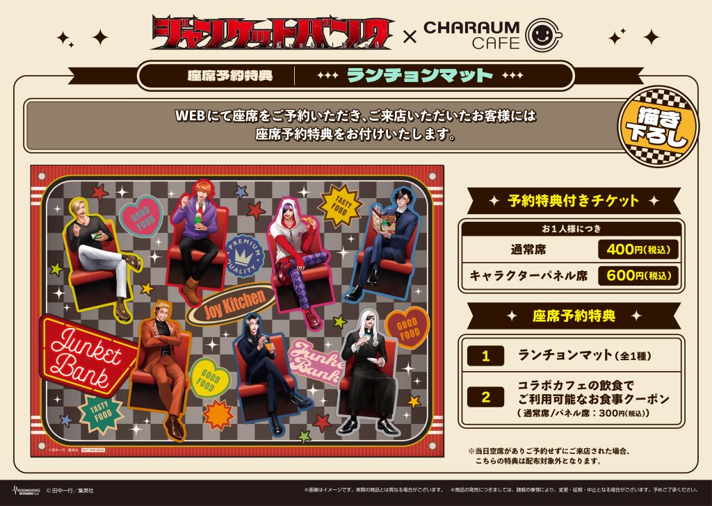 『ジャンケットバンク』×キャラウムカフェの事前予約チケットをご購入いただき、ご利用いただいたお客様に特典ランチョンマット(全1種)をお一人様につき1枚プレゼント!