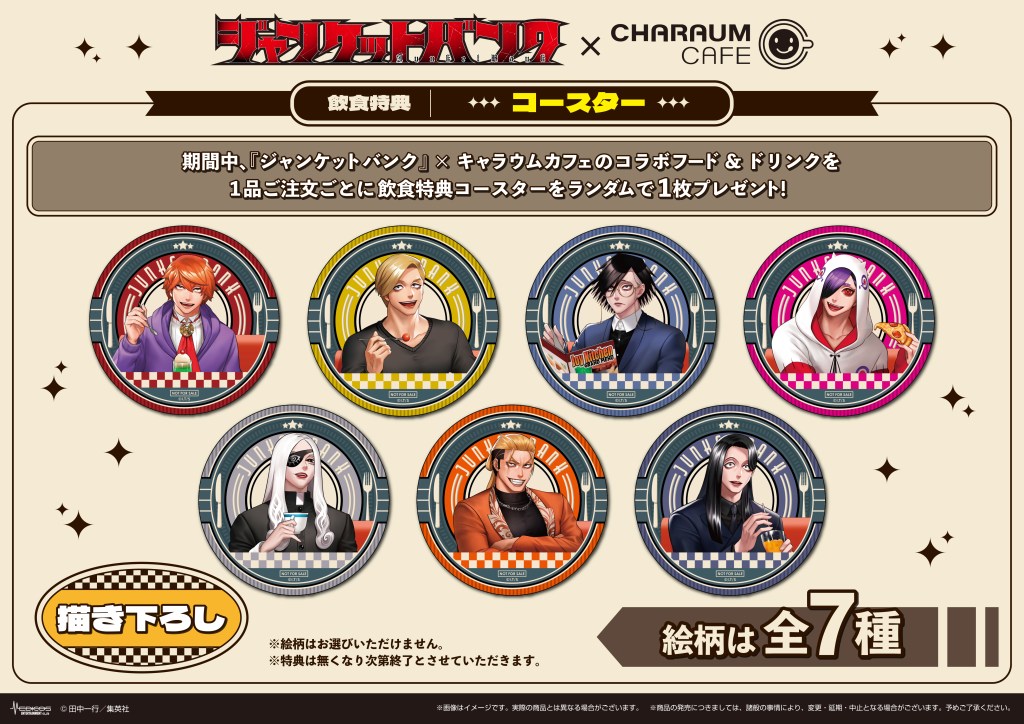 期間中、『ジャンケットバンク』コラボメニューを1品ご注文ごとに特典コースター(全7種)をランダムで1枚プレゼント!