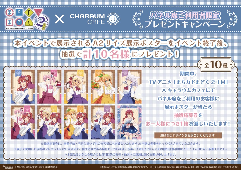 期間中、TVアニメ「まちカドまぞく 2丁目」~喫茶「あすら」池袋出張店~inキャラウムカフェにてキャラクターパネル席をご利用のお客様に、お一人様1回のご利用につき応募券を1枚お渡しいたします。
