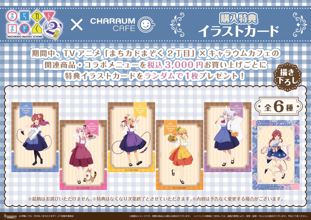 期間中、TVアニメ「まちカドまぞく 2丁目」関連商品(コラボメニューを含む)を税込3,000円お買い上げごとに特典イラストカード(全6種)をランダムで1枚プレゼント!