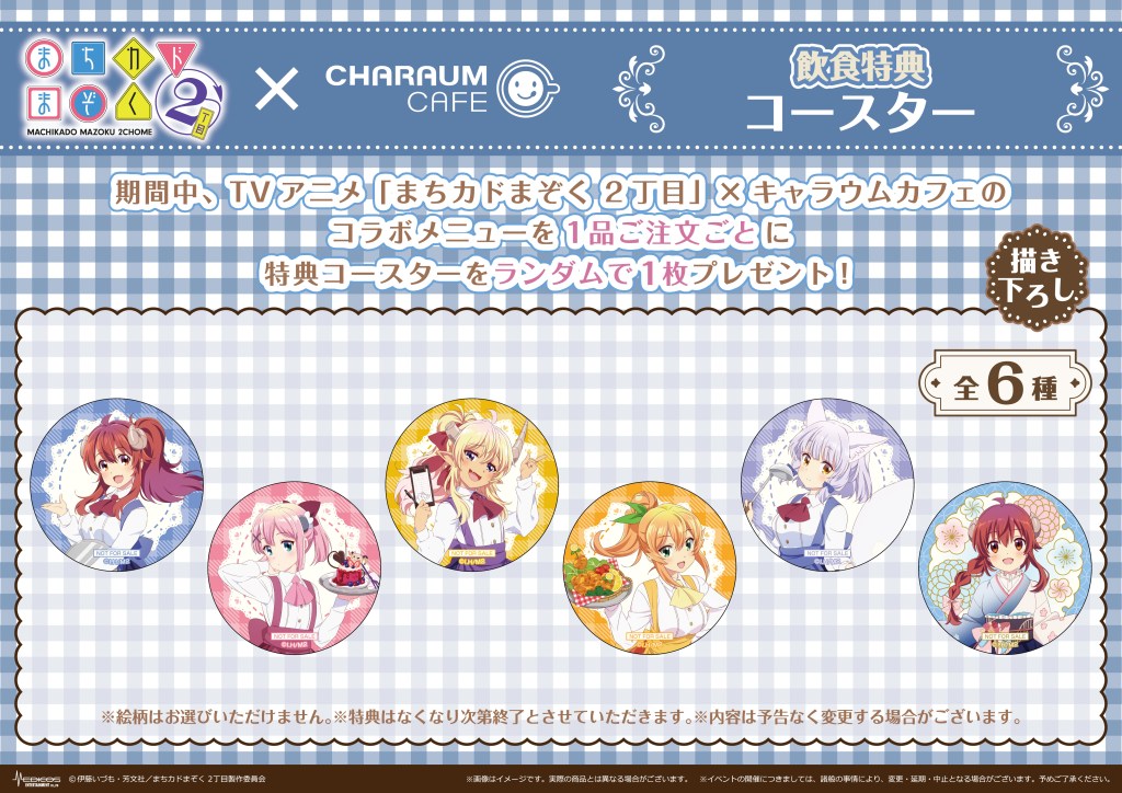 期間中、TVアニメ「まちカドまぞく 2丁目」コラボメニューを1品ご注文ごとに特典コースター(全6種)をランダムで1枚プレゼント!
