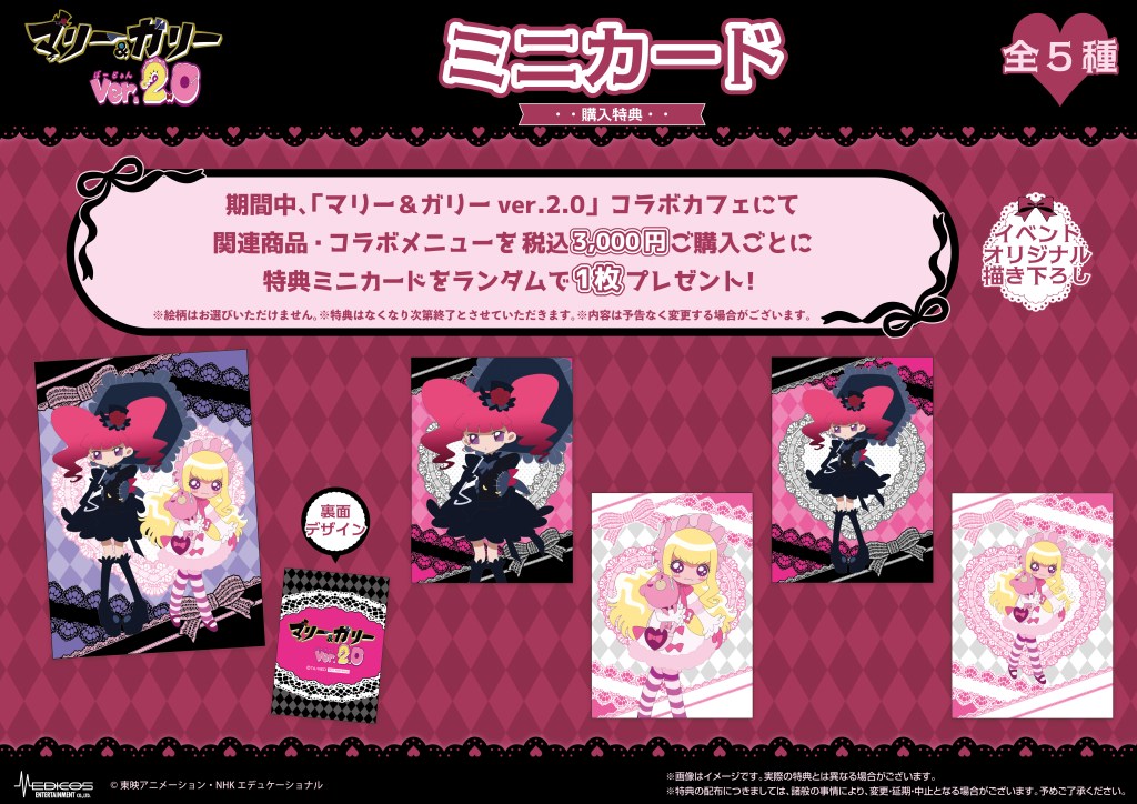 期間中、「マリー&ガリーver.2.0」関連商品(コラボメニューを含む)を税込3,000円お買い上げごとに特典ミニカード(全5種)をランダムで1枚プレゼント!