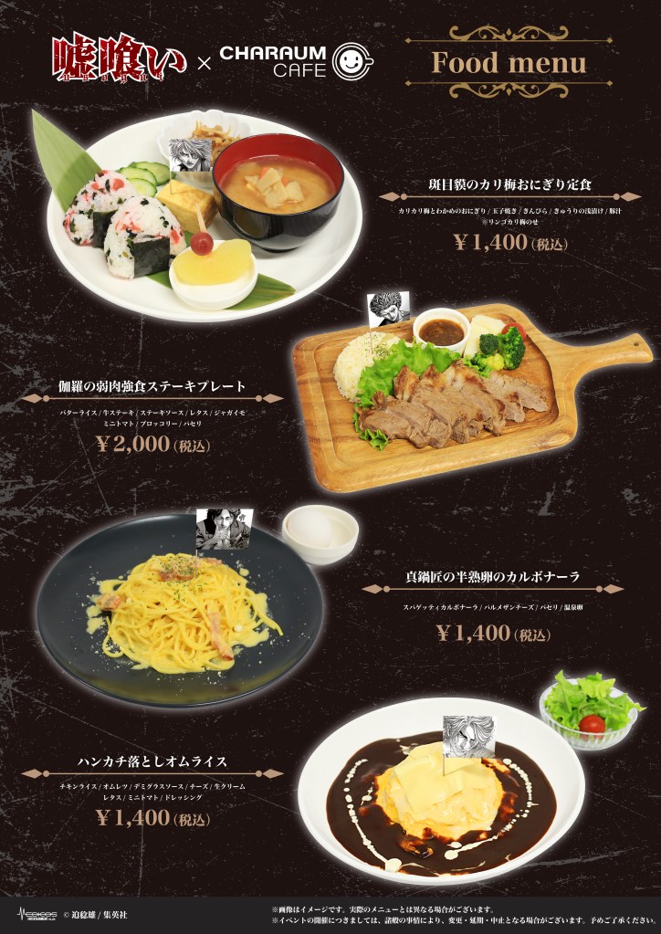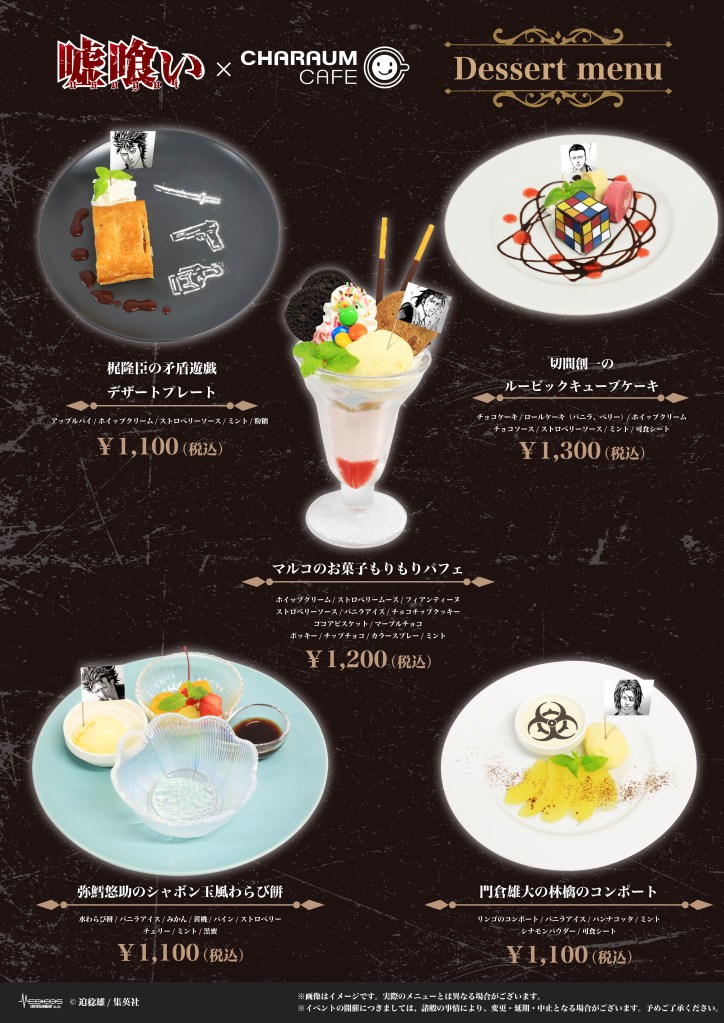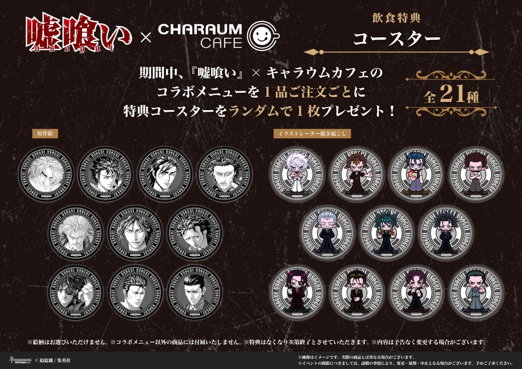 期間中、『嘘喰い』コラボメニューを1品ご注文ごとに特典コースター(全21種)をランダムで1枚プレゼント!