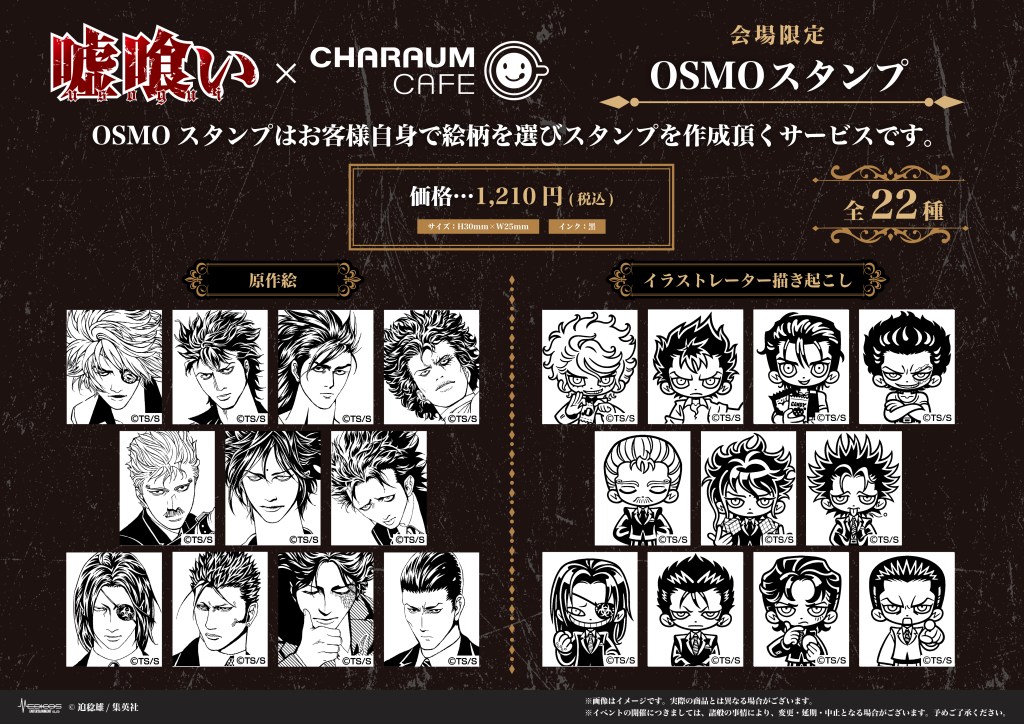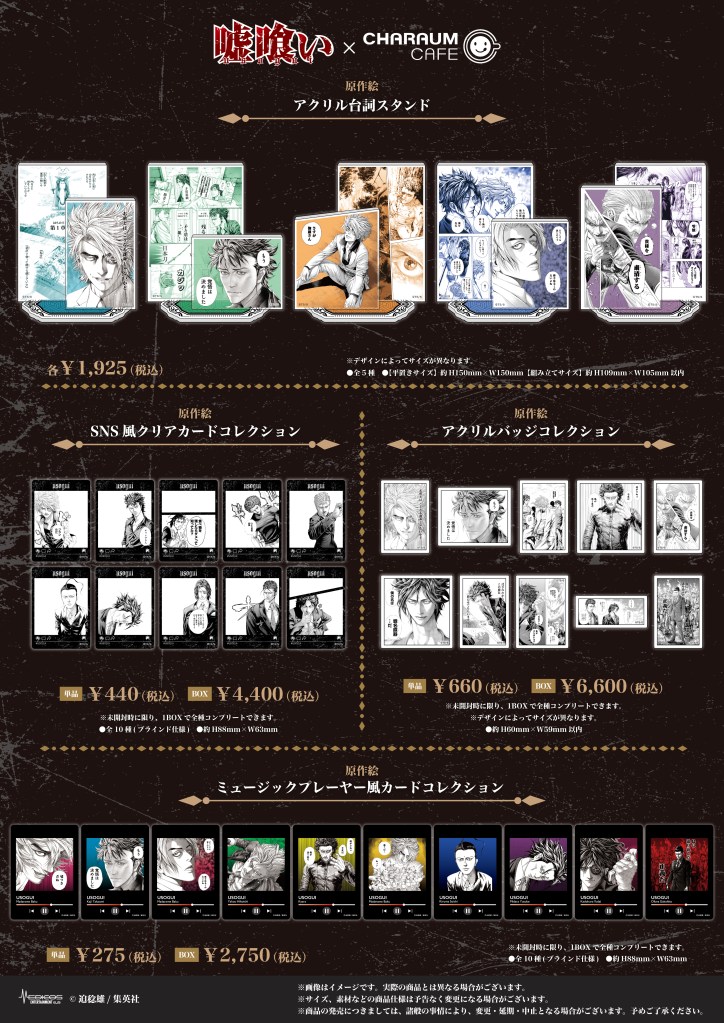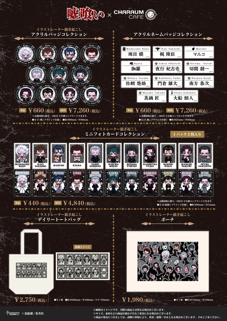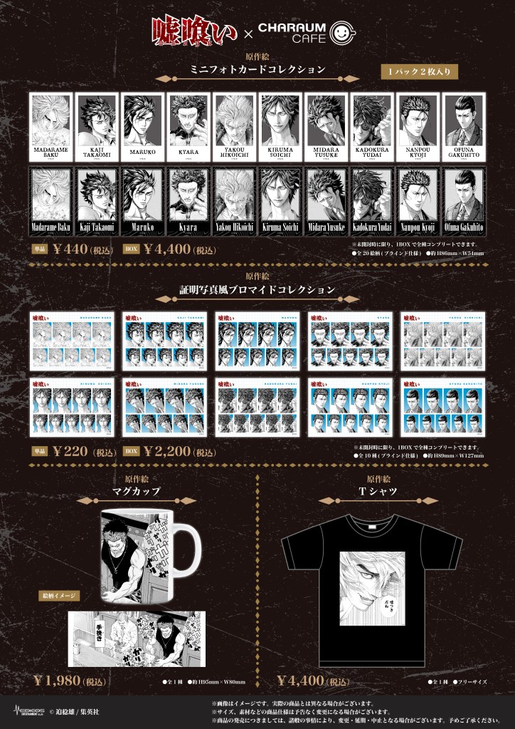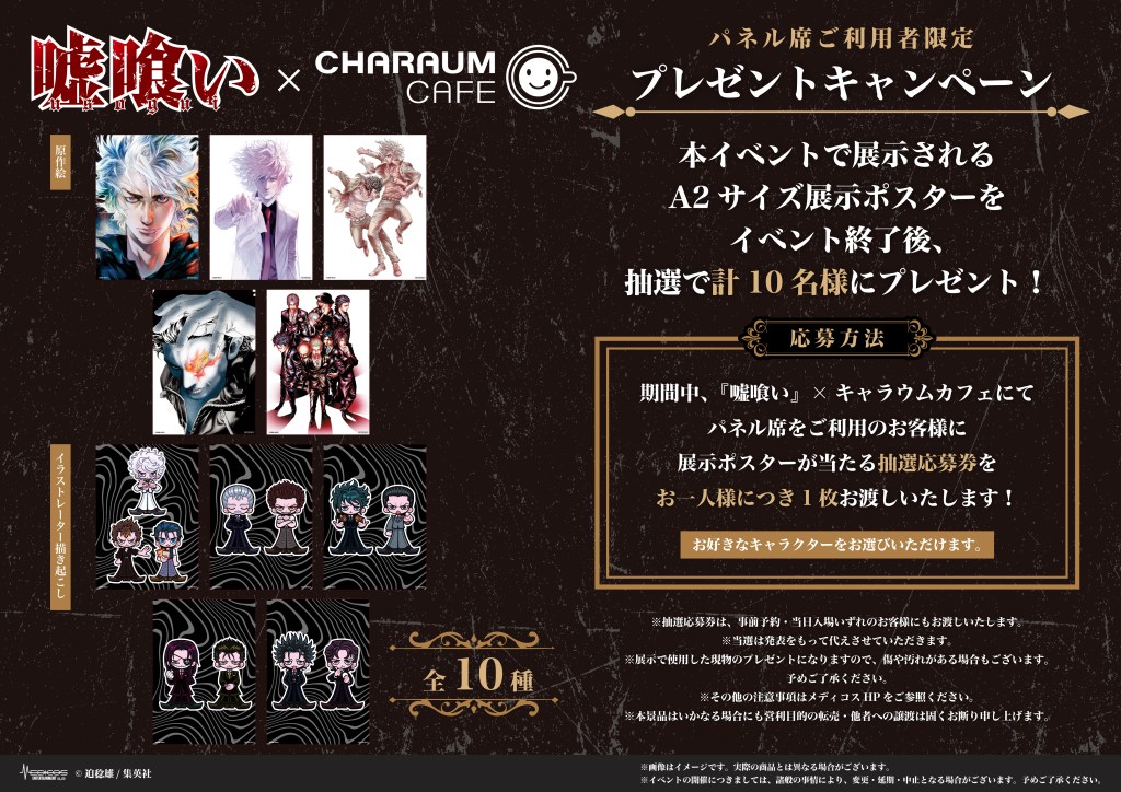 期間中、『嘘喰い』×キャラウムカフェにてキャラクターパネル席をご利用のお客様に、お一人様1回のご利用につき応募券を1枚お渡しいたします。