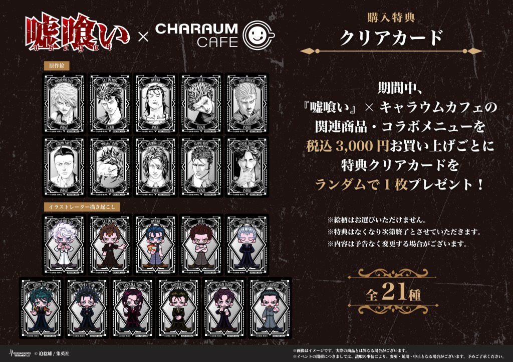 期間中、『嘘喰い』関連商品(コラボメニュー・コミックスを含む)を税込3,000円お買い上げごとに特典クリアカード(全21種)をランダムで1枚プレゼント!